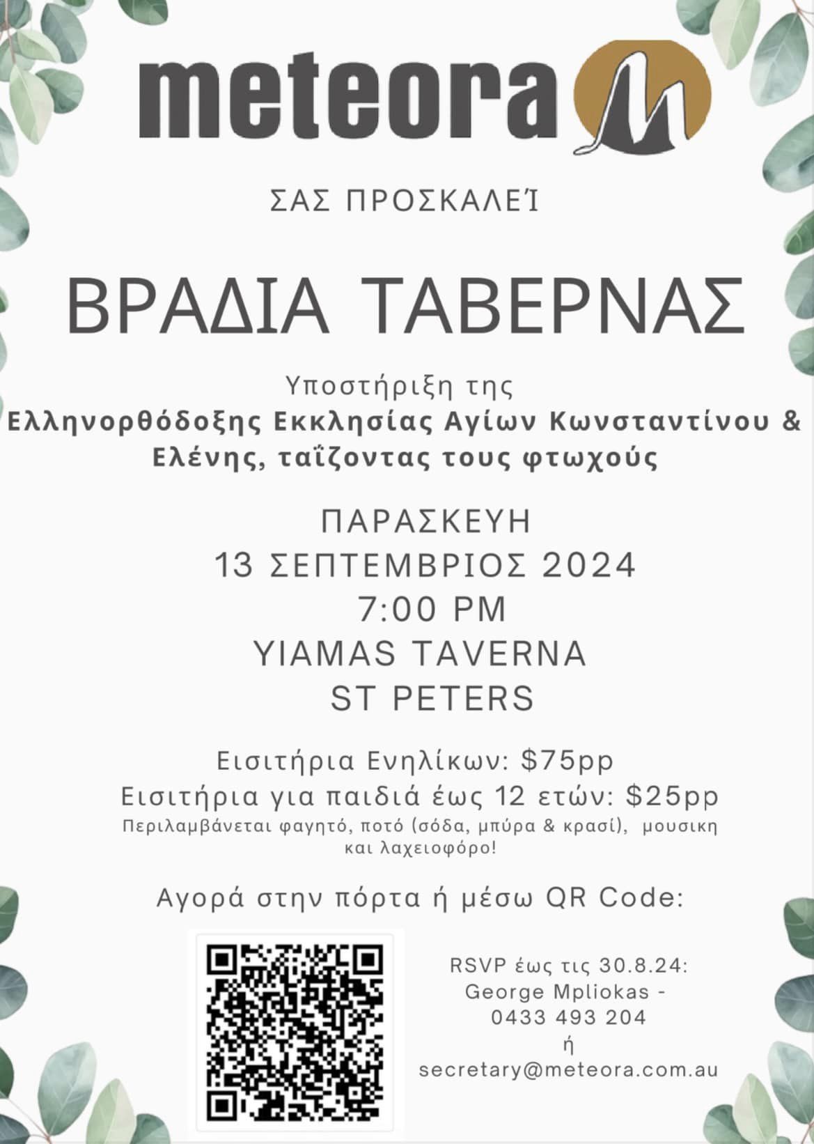 Come along to our Taverna Night on 13 September 2024! We are raising funds to buy critical ingredients for the Saints Constantine & Helen Greek Orthodox Church Soup Kitchen.